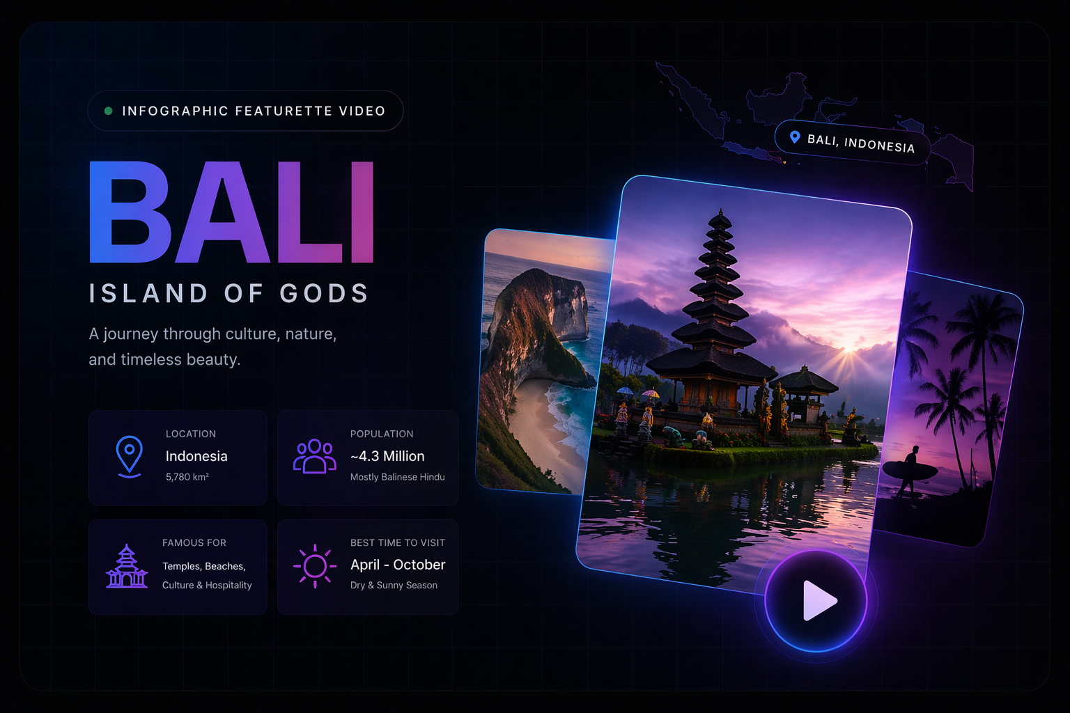 Motion featurette combining destination visuals and infographic-style storytelling focused on BALI.